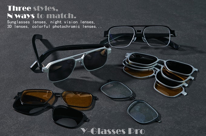 The core innovation ofY-Glasses Prolies in its smart magnetic design, allowing you to easily switch various functional lenses to customize your visual experience for different scenarios. Each pair ofY-Glasses Procan accommodate three styles of functional lenses, including the classic styles from Y-Glasses and the new aviator style.