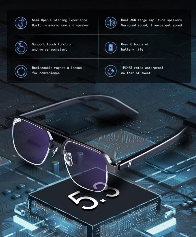 Using TWS technology,Y-Glasses Proallows seamless switching between single and dual ears. With dual ACC large amplitude speakers and directional sound technology, enjoy a pure noise reduction experience and stunning stereo effect. The built-in algorithm touch sensor supports both voice and touch control for flexible operation.