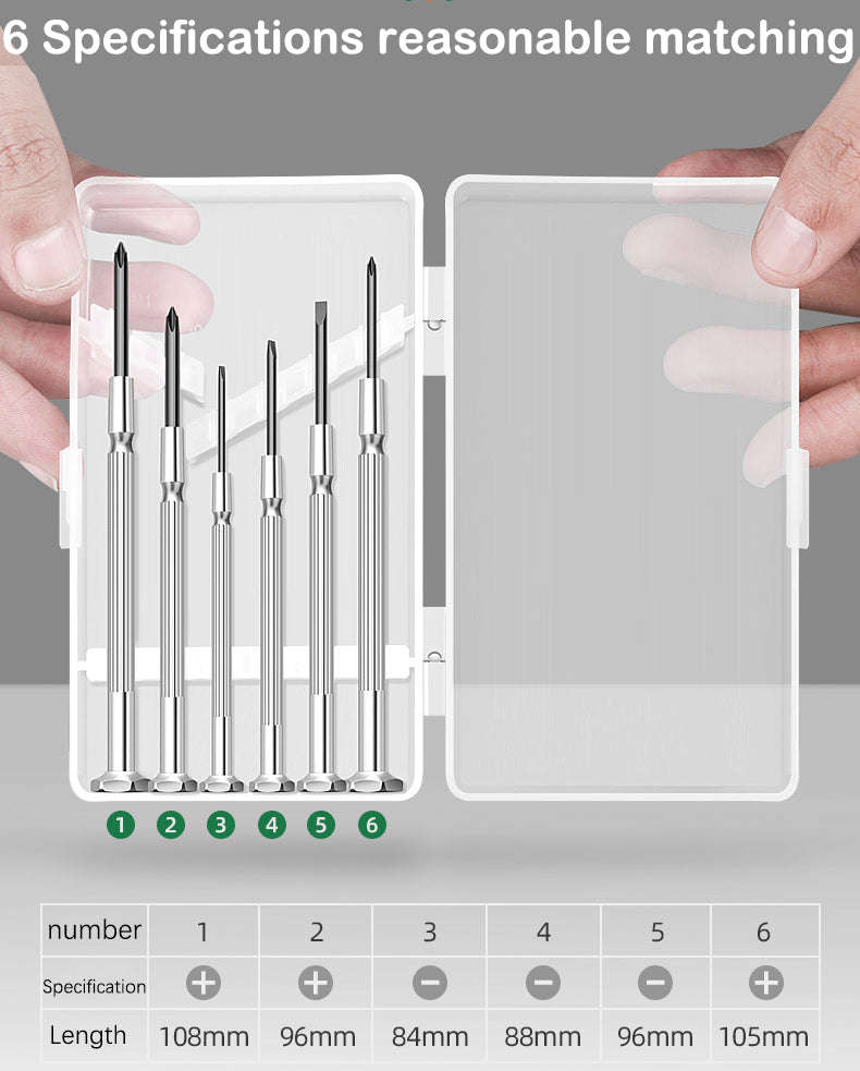 This precision screwdriver set has 6 sizes, which are well-matched and portable to use. It can easily cope with the repair of eyeglasses and the replacement of accessories.